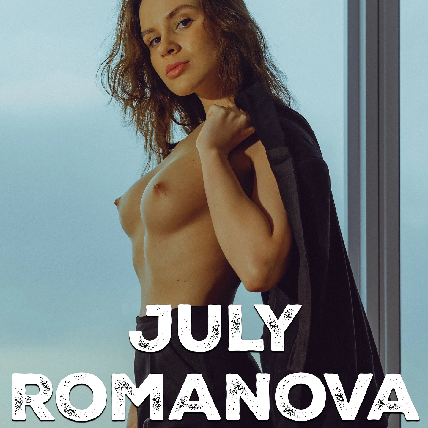 Model July Romanova posing in a suit and heels during a photoshoot. From clothed to nude. Contains 27 images.