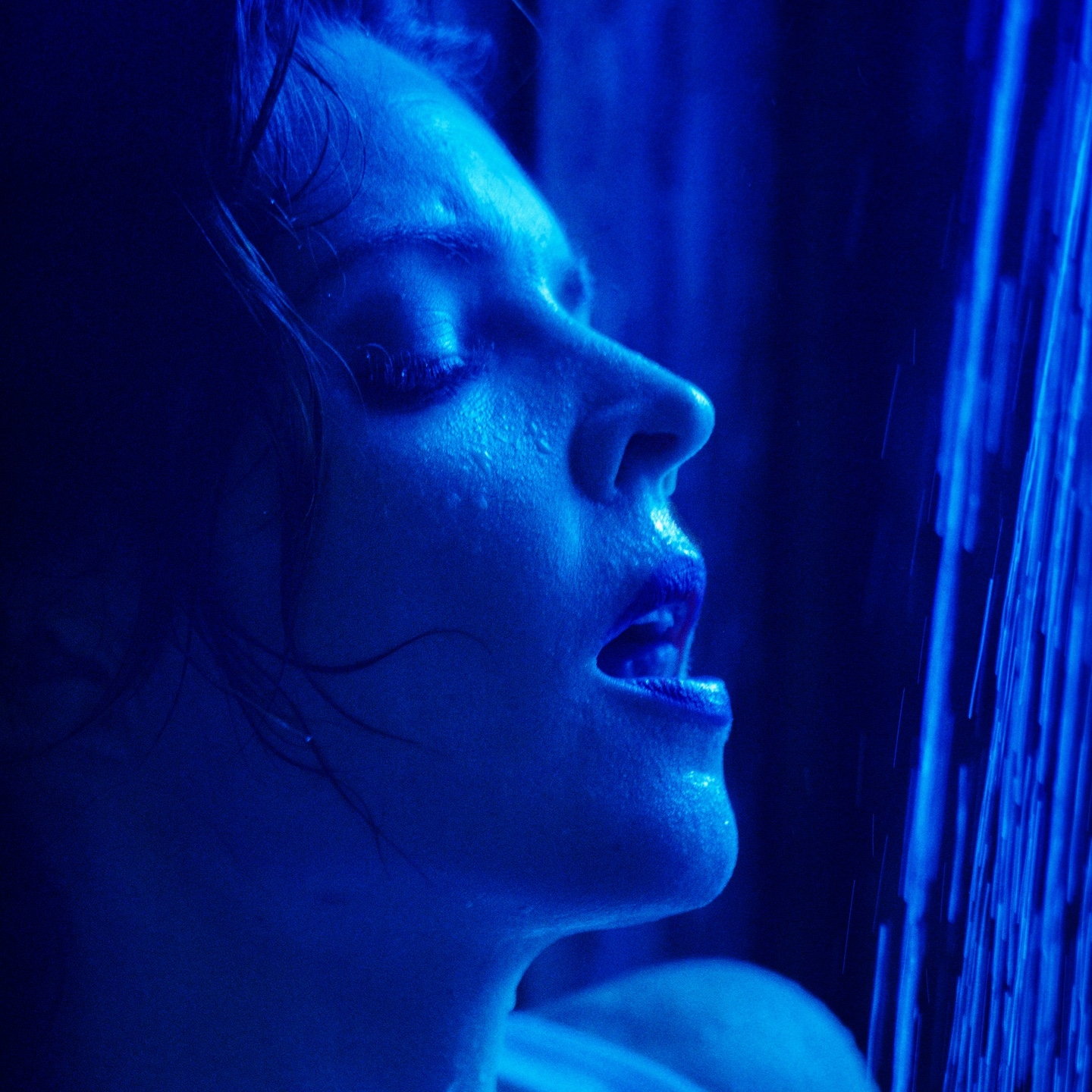Kristy Jessica embraces herself wearing a wet t-shirt in a cabin shower, feeling herself with subtle pleasure.