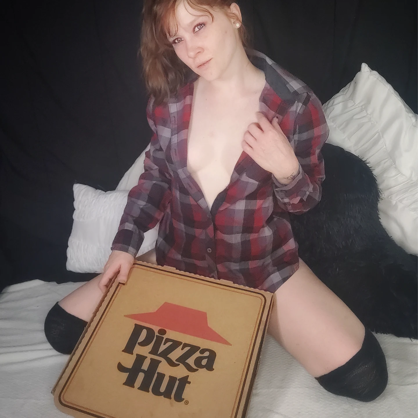 If pizza and pussy are your favorite things to eat, you're gonna wanna see this set!! I hope you're hungry, babe. Pizza Slut photoset. same concept as the video but in photo form without the penetration, but pov selfies with the fuck machine cock, and several suggestive or nude images wearing a pizza hut shirt, hat and thigh high stockings
