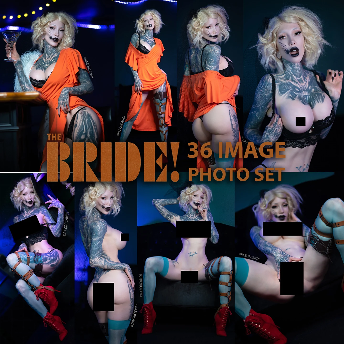 The full photo set has 36 images with 9 in the full cosplay outfit, 5 in lingerie, 11 topless and 11 full nude images with 2 of those being spread pussy/ass shots!