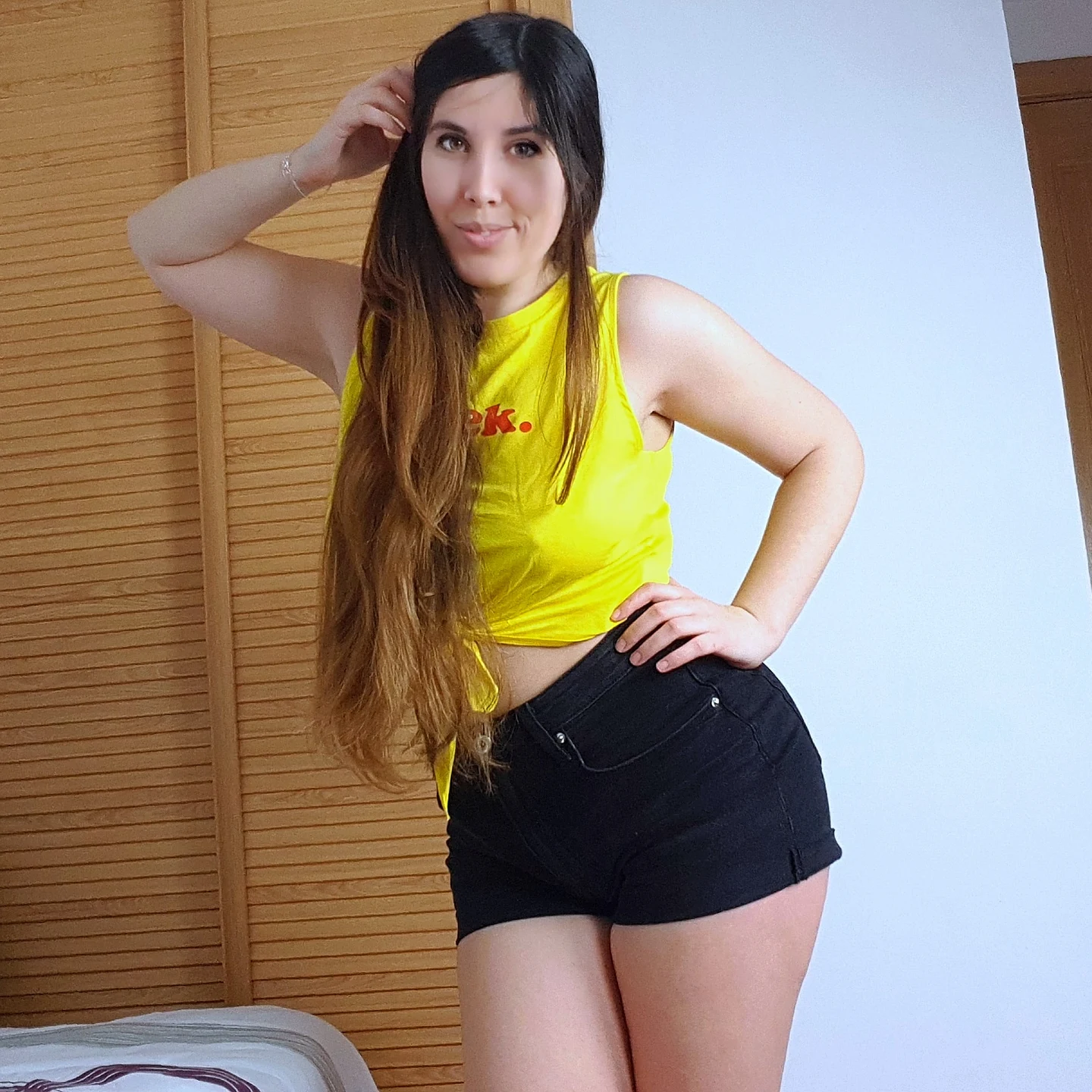 Top amarillo y short negro cortito
