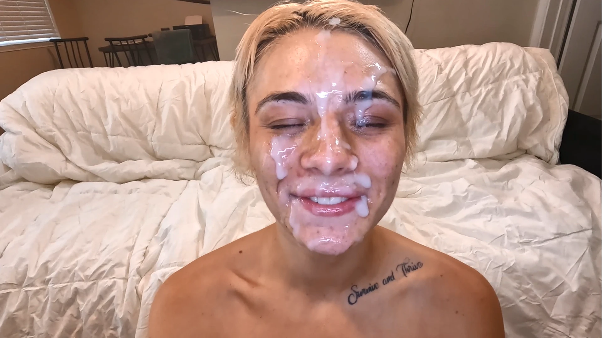 Ellie Smoke is just a ray of sunshine. Her pretty face and cute smile made my balls get that feeling. She also has an adorable voice. She get naked and shows off her little body. I loved her cute tits. Once I put my dick in front of her, she couldn't resist. It was amazing seeing such a pretty girl sucking on your dick and balls. She teased me and slapped it on her tongue. Almost made me cum a few times but what else is new for me. After I could not take anymore, I unloaded a huge thick white load all over her pretty face. She posed with cum on her face for a little bit after. Also enjoy the sideview of the cumshot. A huge facial for such a good girl.