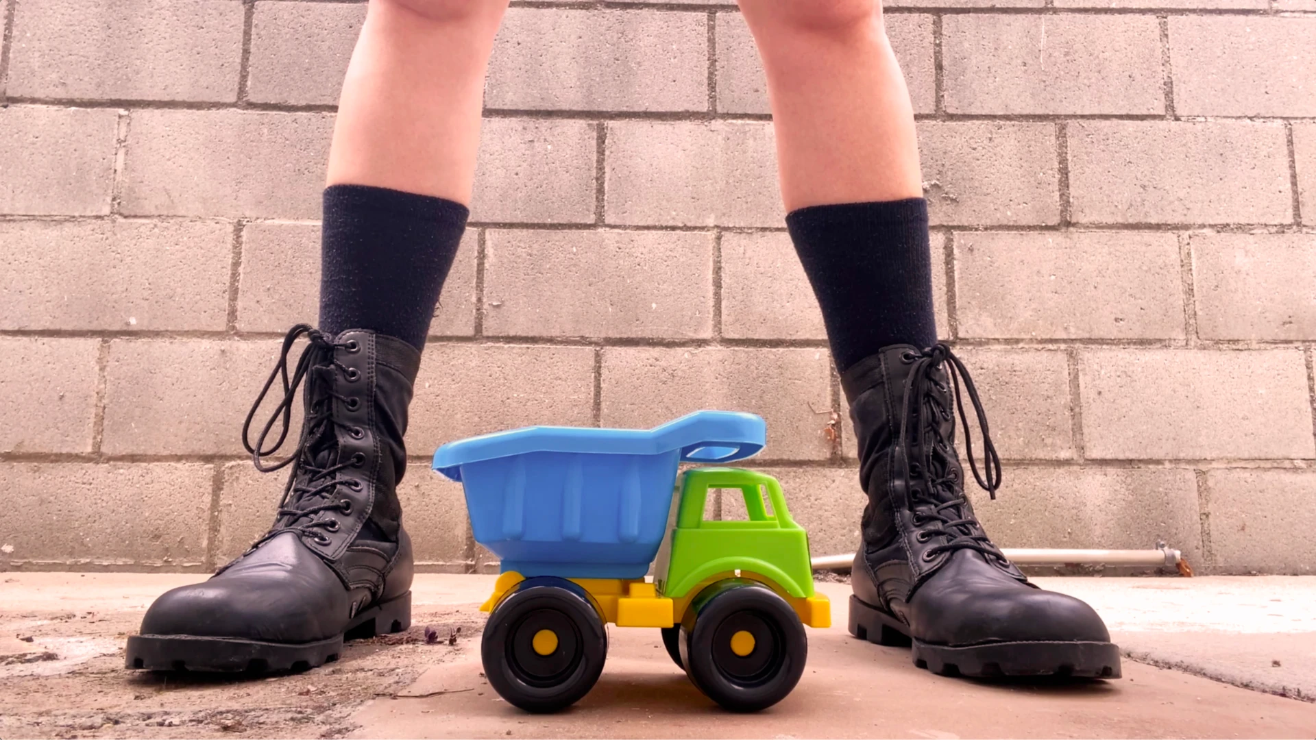 First I measure My combat boots with a measuring tape, both in inches and centimeters, so you can see how big My shoes and feet are. Then I go outside approach this tiny stupid little plastic toy truck that’s on the concrete floor, and tower over it, thinking about how I’m gonna exterminate it. I tease a little, so you never know when I’m actually gonna strike and stomp it, leaving it a surprise. I play with it a little, like a cat with a mouse she’s gonna eat. Then I finally step on it and balance on it, without holding to anything so it’s all My own body weight, and it starts to inexorably and pathetically being compressed under My weight. The wheels aren’t resisting long, and you can hear the truck cracking painfully. Then I suddenly jump both feet on it, and the wheels go flying! Then I proceed to violently stomp on it and jump on it until it’s fully flattened. One wheel even get stuck under My boot, so I stomp on it with even more strength to punish it. I’m also playing soccer/football with parts of the truck. Then I show you the aftermath in the end from above.