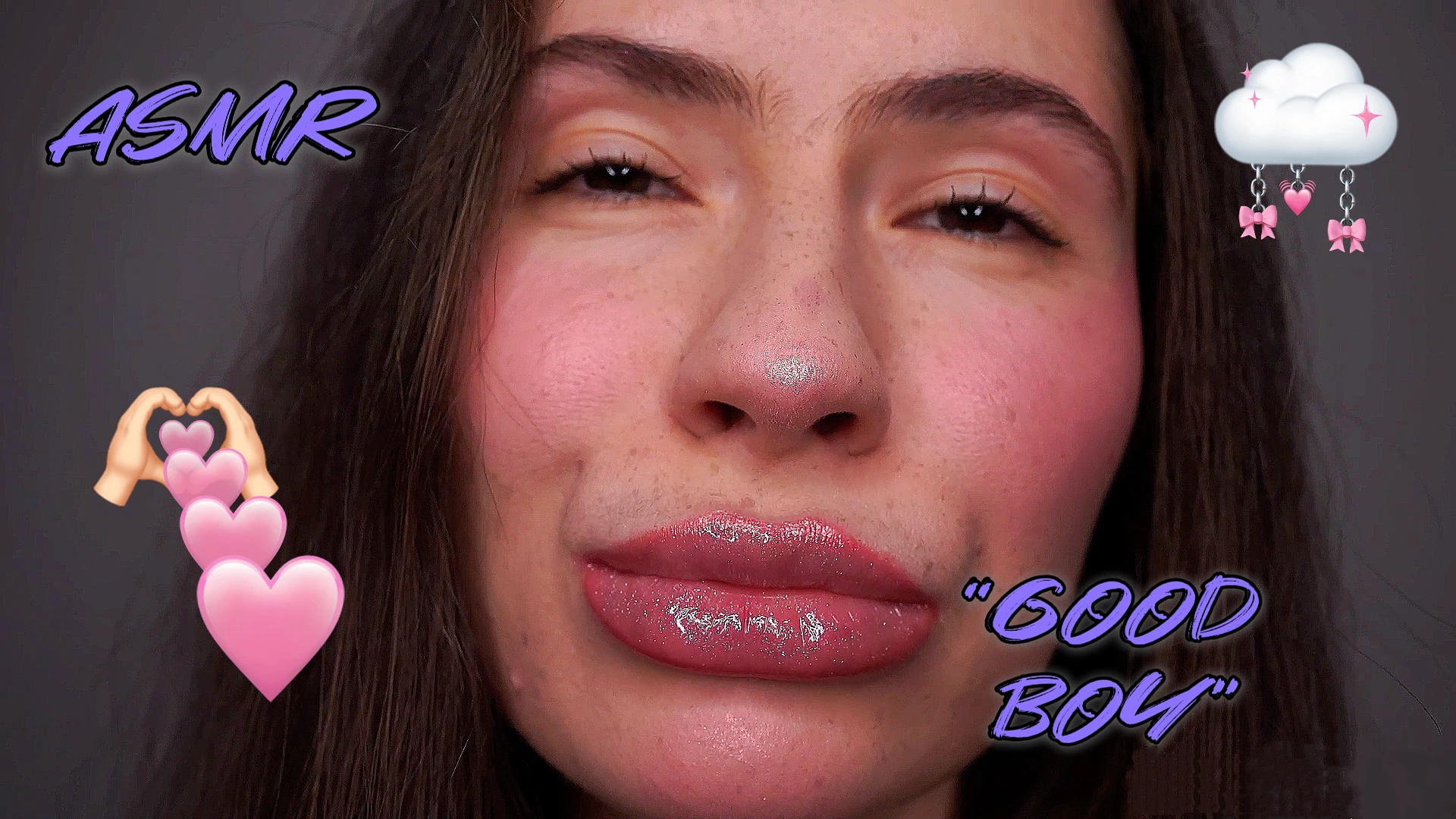 The video opens with a close-up of her glossy lips, shimmering under soft light. voice sultry, and whispers, "Good boy," with a teasing smirk—playful and flirty. The scene shifts; her tone turns warm and proud, eyes sparkling as she says, "Good boy," like a reward. Next, her voice drops low, almost commanding, with a sly grin, "Good boy," exuding control. Finally, she giggles, sweet and light-hearted, tossing a cheerful "Good boy" with a wink. Each phrase drips with a new emotion, keeping you hooked