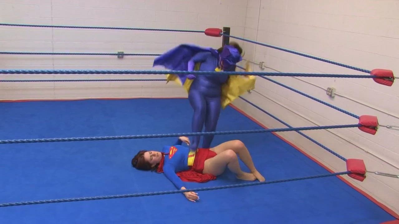 BatTracy and SuperJackie are relaxing and discussing crime fighting when they are suddenly frozen in place and cannot move. Instantly they are transported to far away planet! The sexy heroines are beamed into a ring and are told they must fight each other to prove who is the strongest woman in the galaxy. They have been brought to this planet because Supergirl's powers are useless here and BatTracy has been stripped of her utility belt. The dazzling daredevils must fight each other with their special powers neutralized. At first the caped crusaders are hesitant to fight each, but BatTracy seems to be pepped up from her last fighting encounter and puts some moves on Supergirl. However, BatTracy's upperhand doesn't last long. Supergirl turns the tables on BatTracy with an amazing head scissor take down! Will BatTracy be able to recover and be claimed the best super heroine in the galaxy? Tune in to find out!