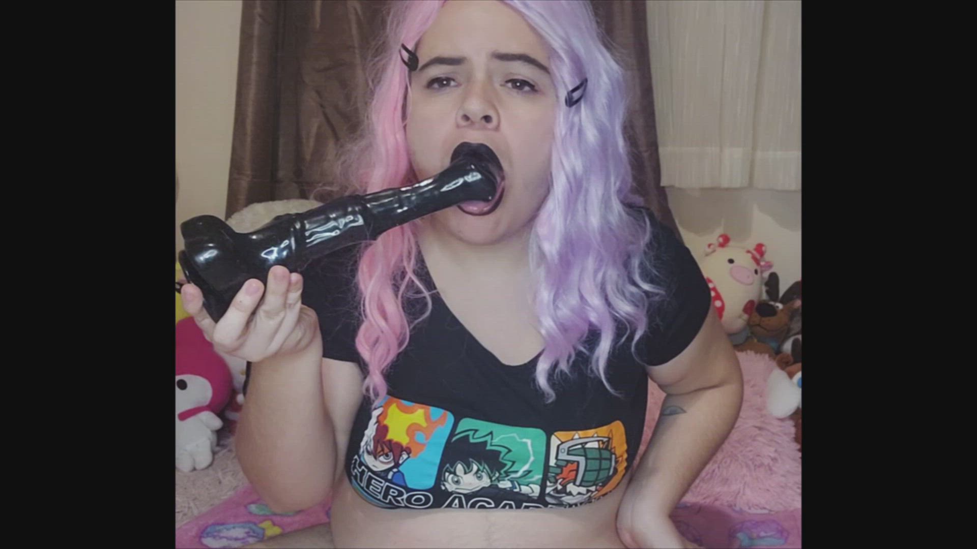 I show off my curvy body in my cute anime tee, getting all worked up with my favorite Bad Dragon toy. Watch me deepthroat it sloppily before riding it deep in my wet hole until I explode in pleasure. You won't believe how much I crave this massive beast!