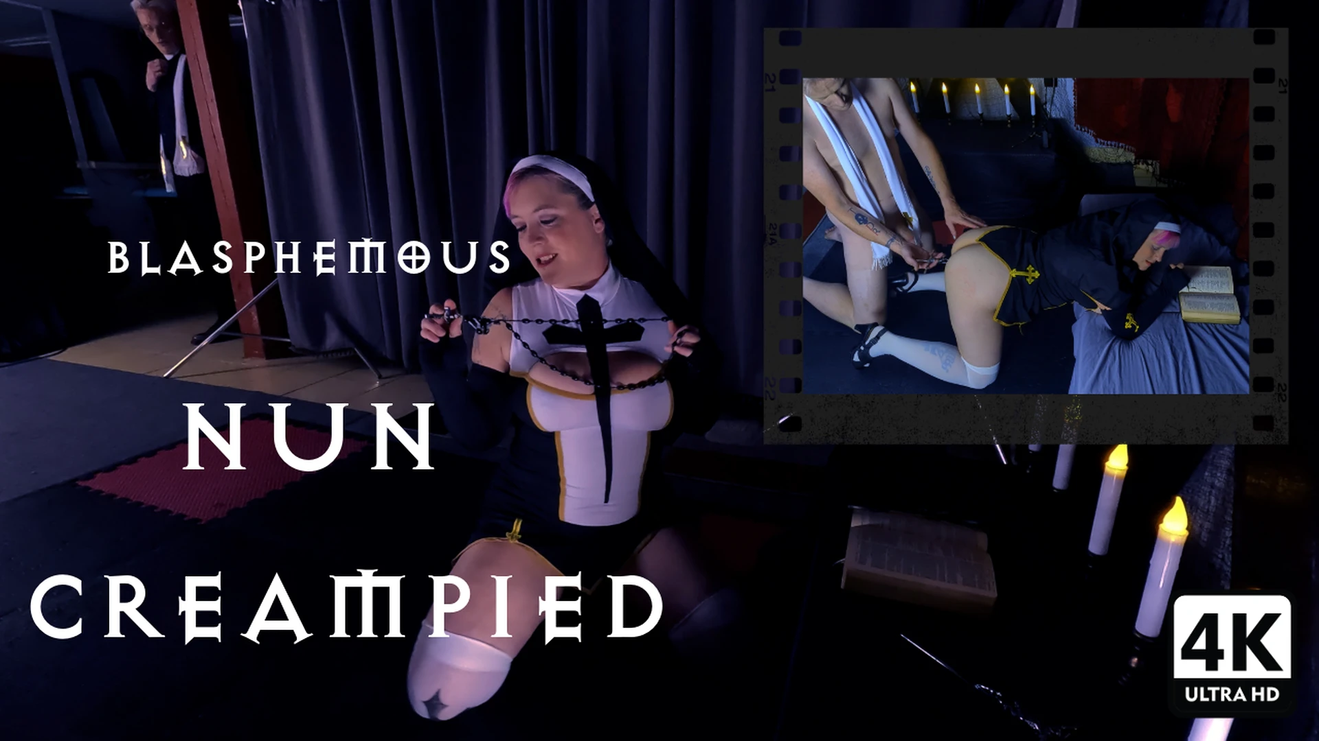 Kneeling half-naked and trembling before her confessor, she witnesses his massive holy relic growing stiff beneath his black cassock. The sadistic pleasure dominant priest instructs the obedient nun to worship his thick 7.5-inch cock with her devoted mouth before bending her over the altar for unholy communion. He pounds her blasphemous pussy raw in multiple positions and baptizes her womb with a massive sanctified creampie load that drips from her thoroughly corrupted cunt.
