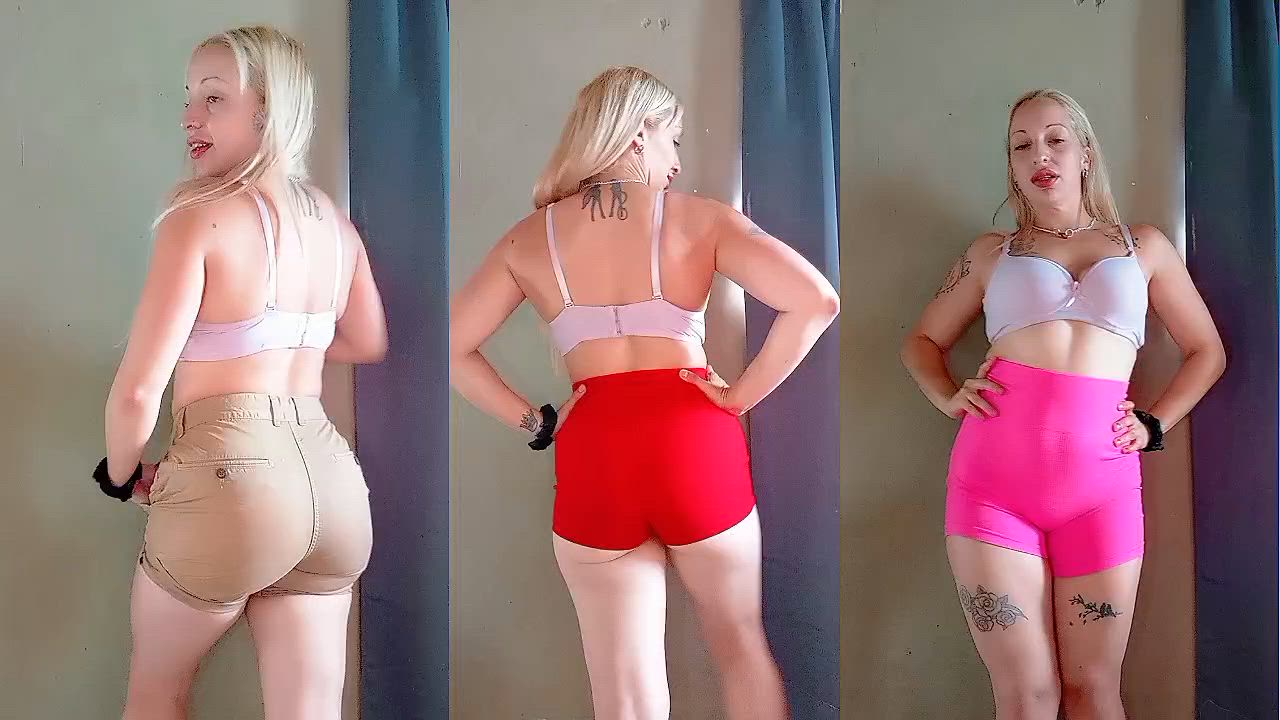 Trying on different tight and wide shorts, modeling and posing in front of the camera