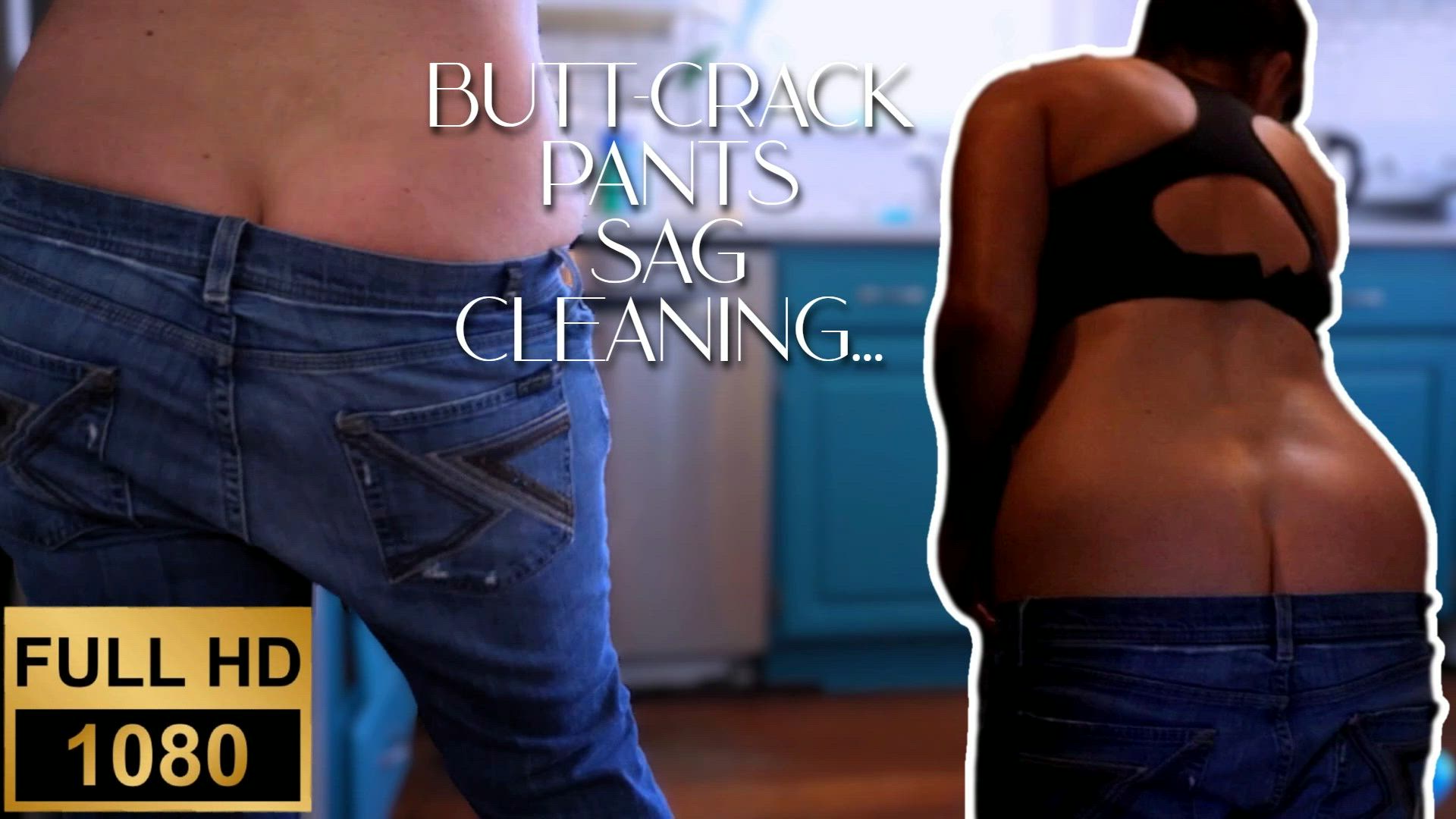I wear blue worn jeans, no panties, and a sports bra. I film myself cleaning around the house, in a few different rooms. As I bend, stretch, and squat, my pants sag more and more. Revealing more butt-crack.