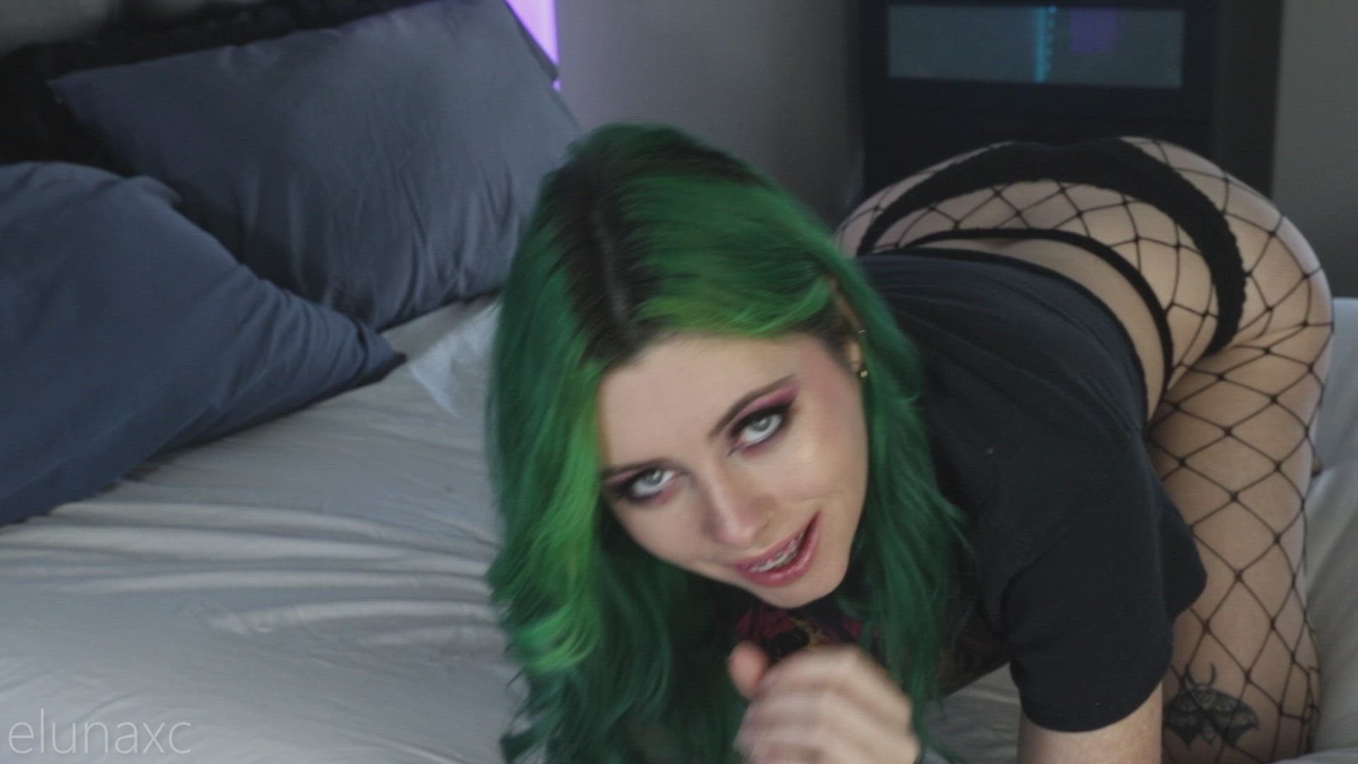 You come home early to find your crazy ex girlfriend in your bed humping your new girlfriends pillow. You're actually not surprised at all, kind of happy to see she dyed her hair green and also kind of annoyed because she is a vixen and she always gets what she wants from you. You ask her for the key to your place back but she has other plans. She teases you with her body in her cute little fishnets, one of your weaknesses (which she surely knows) You don't waaaaant to cheat on your girlfriend but remembering how good she is at sucking your dick you quickly cave in.