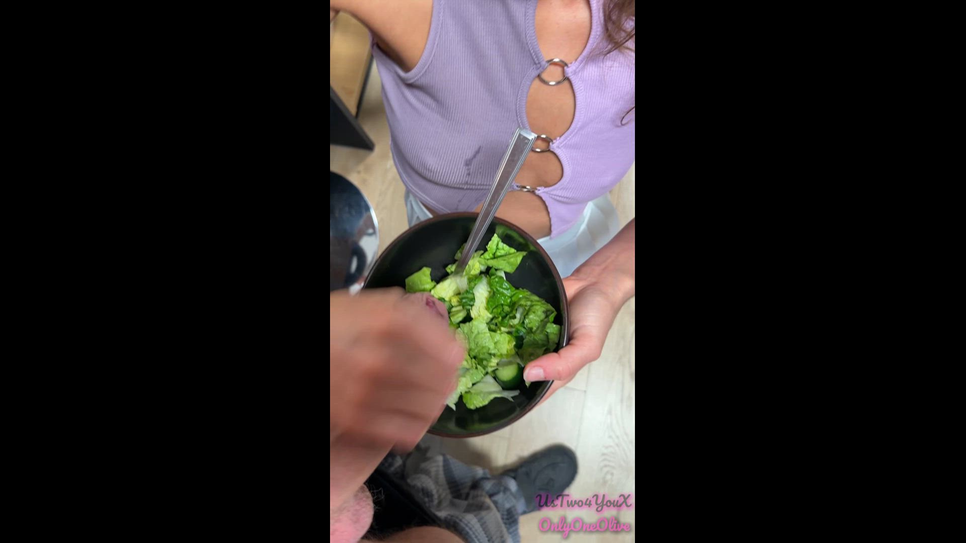 I made myself a fresh salad but it tasted so blandβ¦ I tried adding salt but it still wasnβt right π So I called hubby over and told him I needed a much better dressing π I gave him a handjob, stroking him till he was throbbing, then finished him off right over the bowl π shooting a big warm load...