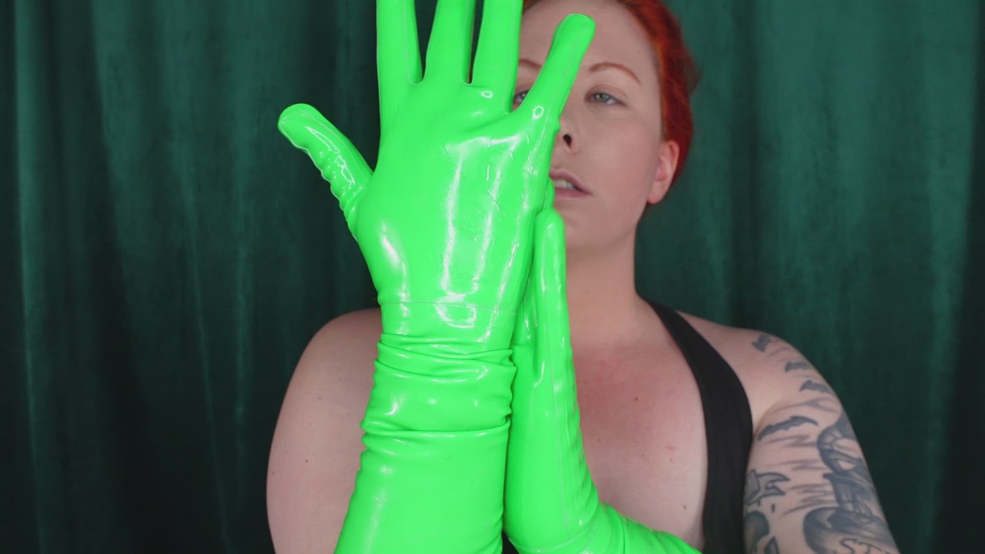 Close up sexy quick jerk off instruction to my bright lime green latex gloves!