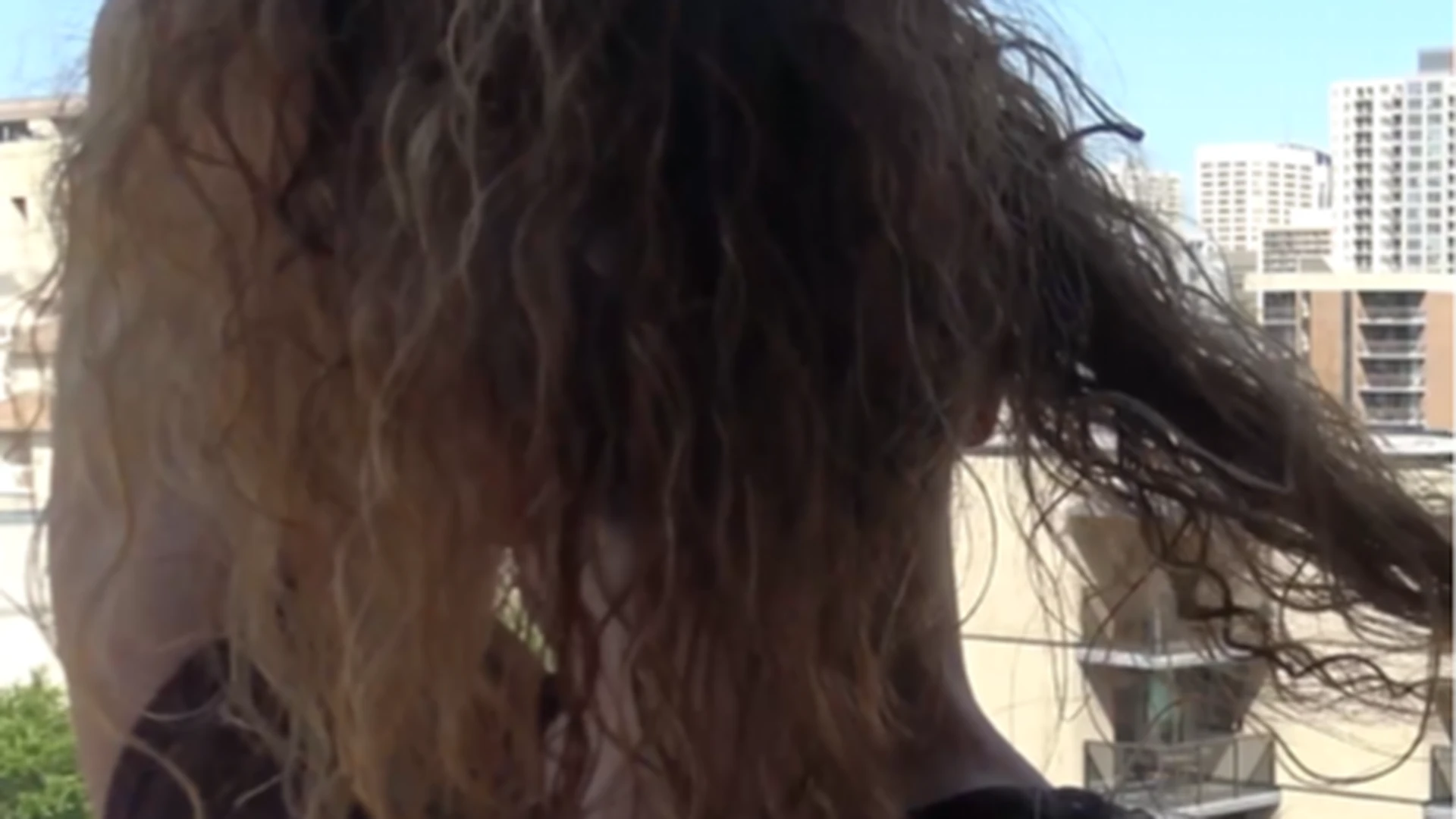 I am standing on a balcony enjoying the view of all the buildings downtown. (Just joking, I am wishing I was surrounded by plants and mountains!) I can't stop playing with my amazing curly hair. Long, natural curls reach all the way down to my waist. See me shaking, lifting and dropping it so...