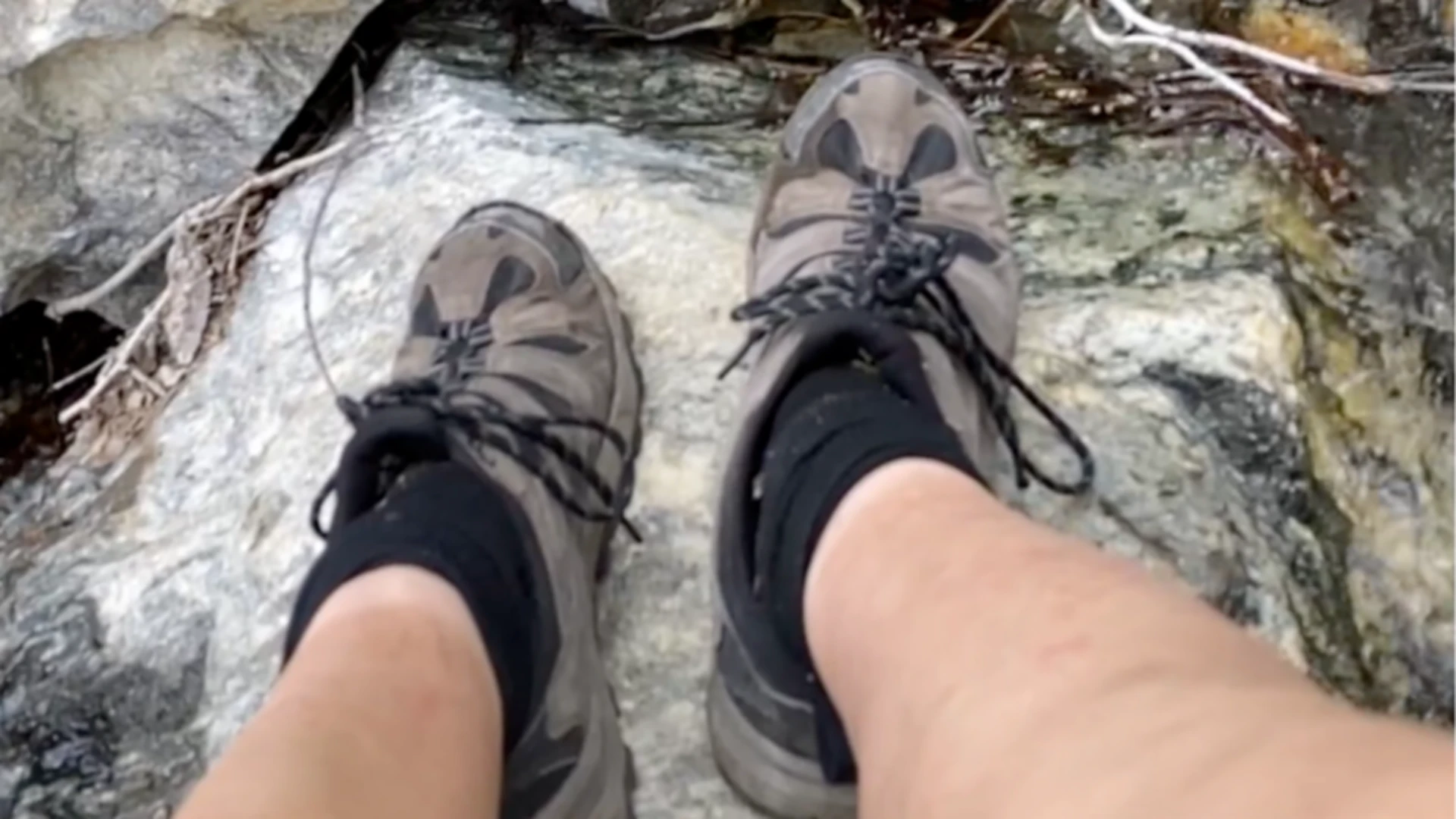 Hiking off trail by a beautiful waterfall in My dirty hiking shoes.