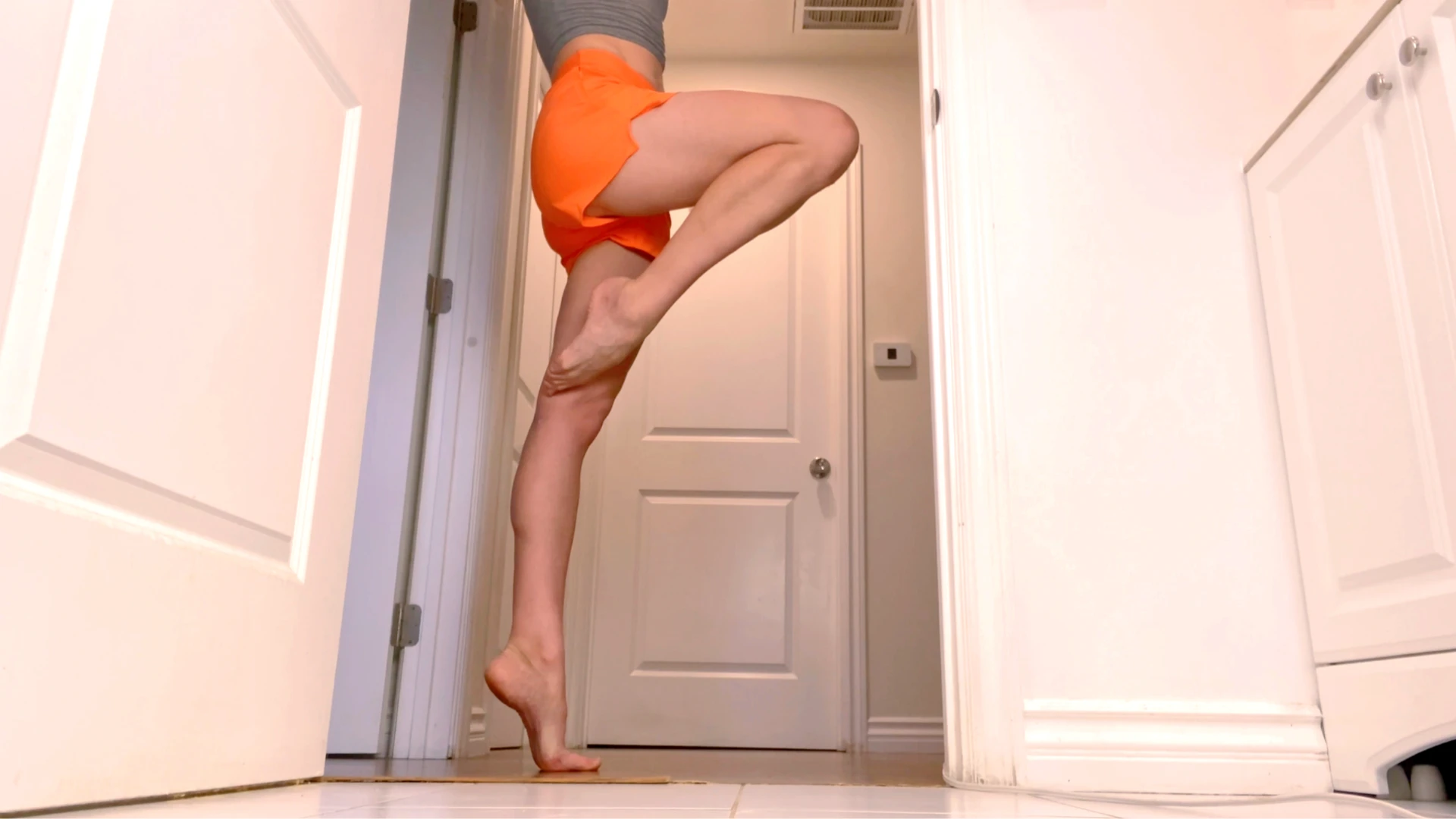 Be entranced by My amazing ballerina legs and feet, as I'm gracefully moving around by My bathroom door, showing off My long fit legs, My pointed feet, arches, toes, soles, with beautiful fluid ballet dance moves. No music and no talking.