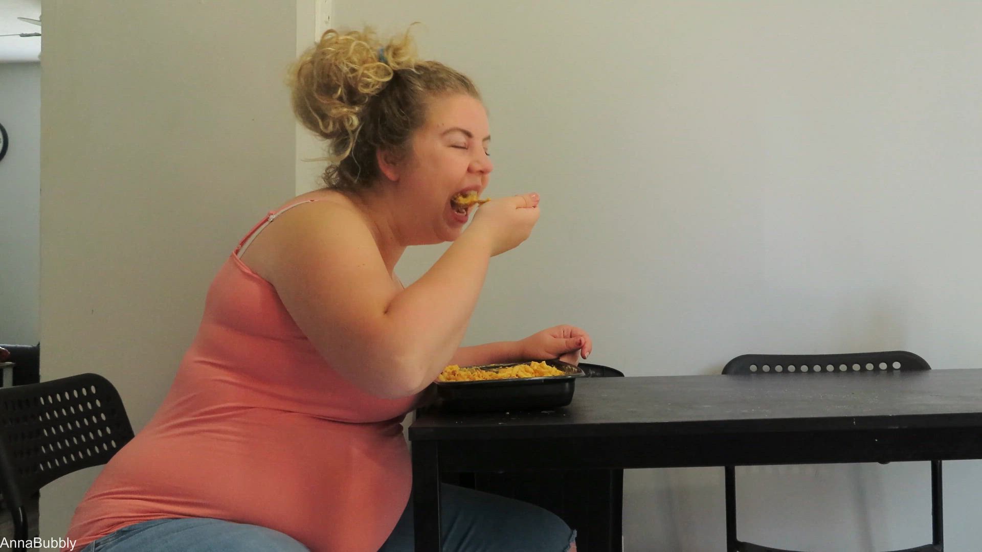 I show off my chubby but flatter belly before starting to eat. I eat a family sized portion of mac and cheese, occasionally talking a bit about my meal. You can see my belly getting bigger as I eat. I start burping about 10 mins in. I decide I am done eating and show off how big my belly got. I look 5 months pregnant!
