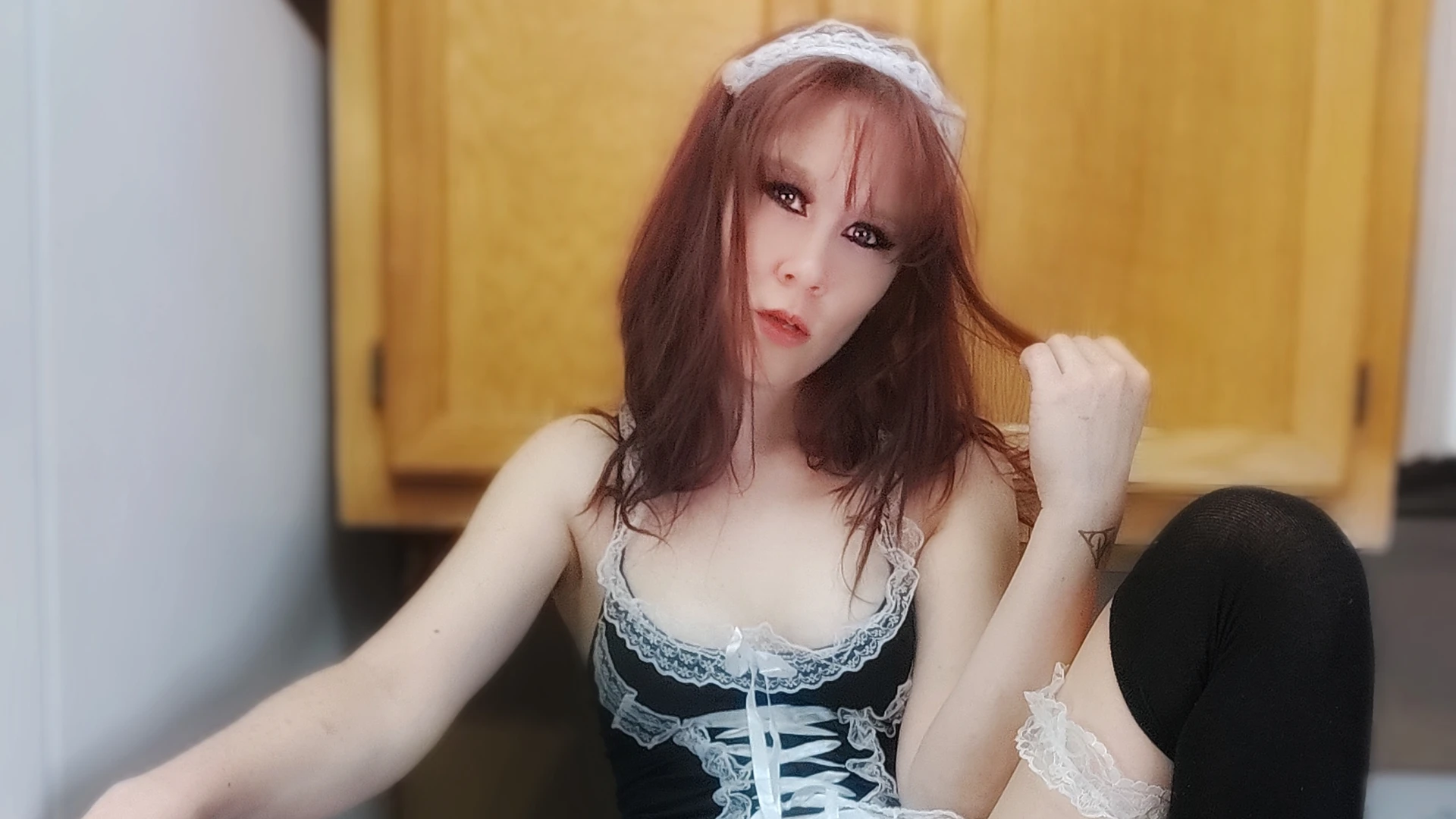 Kitten, in a full French maid outfit complete with thigh high stockings and high heel shoes, enters the kitchen, sees you peeking in, and looks around and says "shh" before climbing on the counter and removing her panties, spreading legs wide for your viewing pleasure, top rolled down and tits...