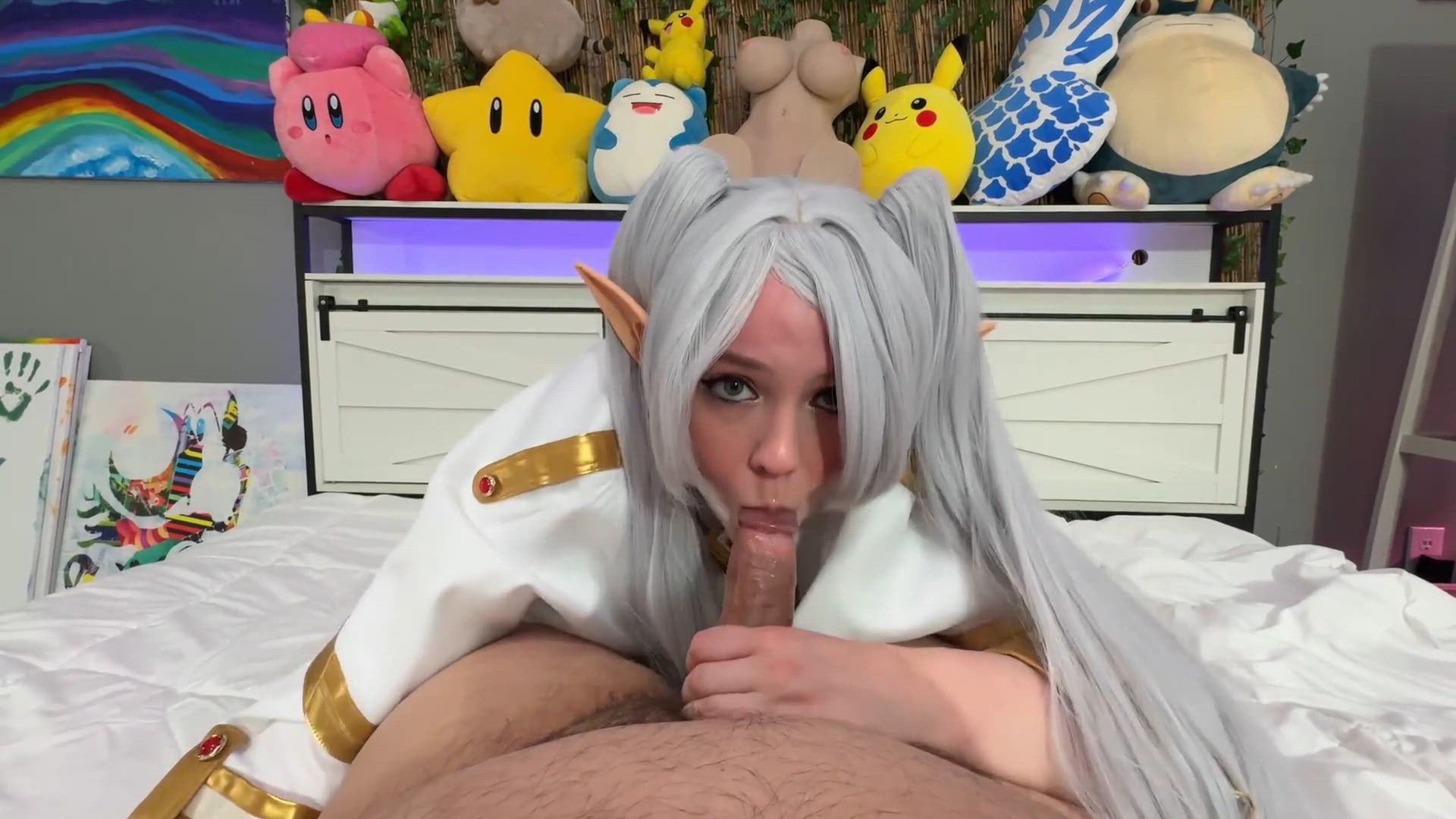 I embody Frieren in this steamy POV encounter, craving those sweet head pats as I devour your shaft with intense oral pleasure and lock eyes with you. Watch me ride you passionately in various positions, twerking my snug core on your length for over 20 minutes of heated action. It all culminates in me eagerly gulping down your massive release—so delicious!