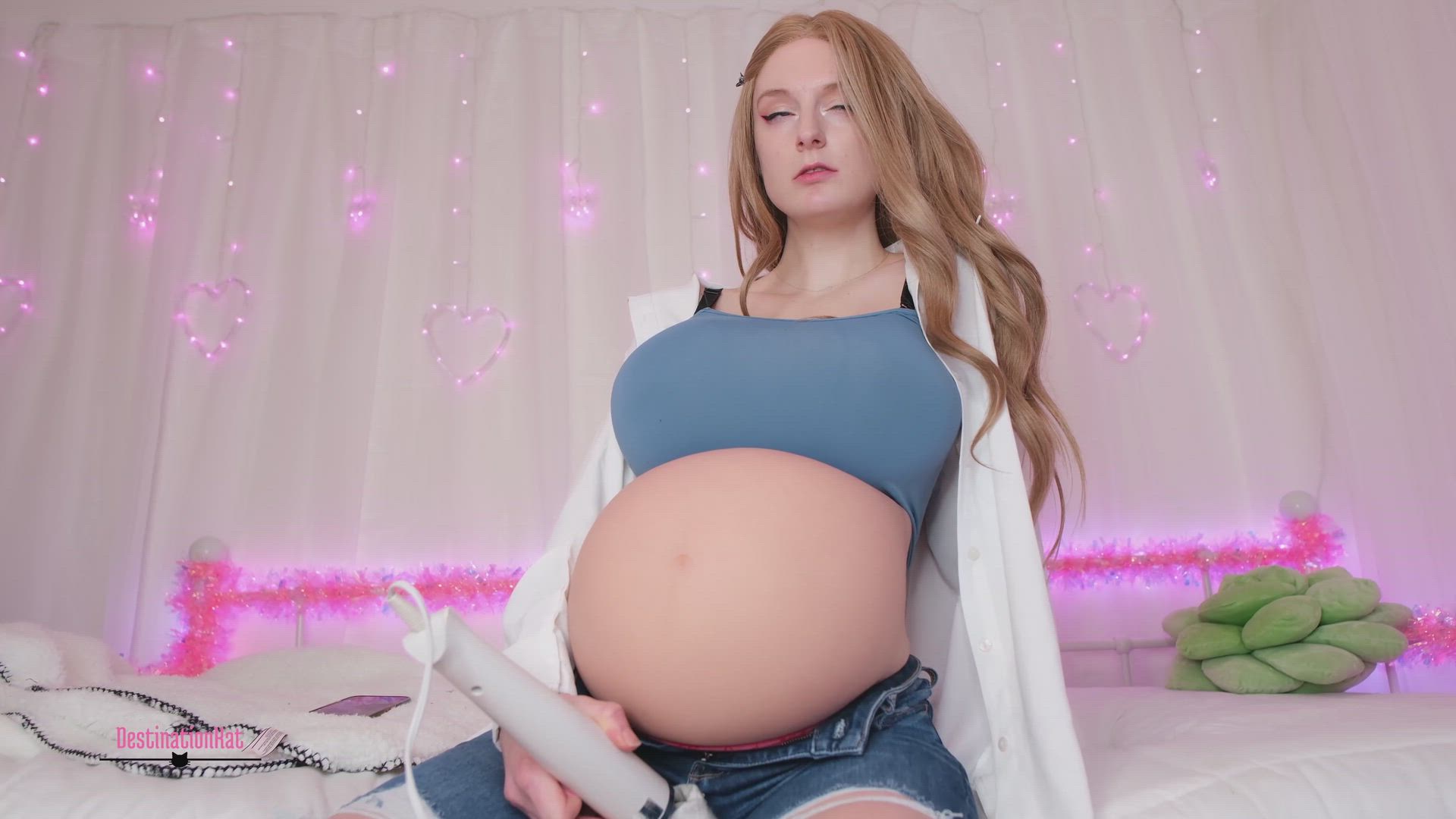 You come home early from work to see me doing some laundry and getting ready to run into work. I catch you staring at me from afar. I tease you about it and being attracted to my huge pregnant belly. I tell you to play around for me as I get dressed to go in. I can't get any of my clothes on though. My jeans won't fasten and even your dress shirt is too small! I can't go in like this! So I decide to stay home with you instead. I pull out my wand and masturbate as you worship my belly. I then get on top of you and ride you from your POV (no penetration shown). After this, I switch to missionary (where I manually move the toy around because the belly got in the way haha) and we fuck until we cum. Includes talk of how you made me this way, growing belly, growing breasts, not fitting into clothes, getting bigger, etc.