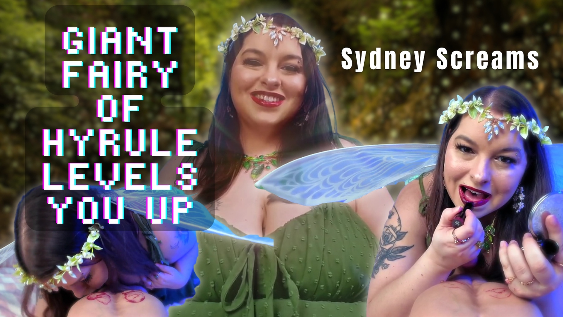 It's time to level up your equipment! As a fierce warrior of Hyrule, you pay a visit to the giant fairy who promises to help you level up with magical kisses. With dark, glossy red lips, this giant fairy begins giving you POV kisses so that all your gear will level up. I grab you and pull you into my pond before I start kissing down your body to your hardening cock. My lipstick prints cover your chest, abs and shaft as I take you as far down my throat as I can. I know what you really want, though! After giving you a blowjob, I climb on top and begin to ride you. Watch as my big tits and belly bounce and jiggle while the plump fairy rides you in cowgirl before turning around to give you a delicious view of their big booty as they take your cock in reverse cowgirl. This fairy is willing to do anything to help her fierce warrior defeat the enemies of Hyrule!