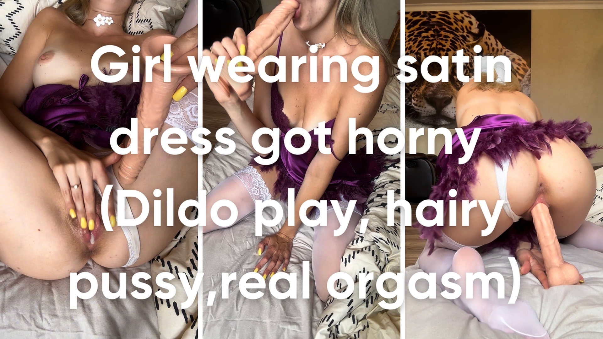 Girl wearing satin dress got horny( hairy pussy, dildo play, orgasm)