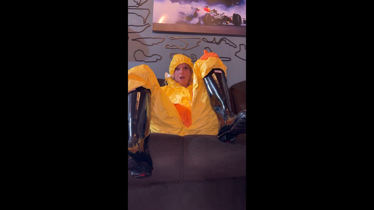 Yellow Hazmat Suit play 🧤👢🤤 With hunter boots, hazmat suit and rubber gloves, I rub my pussy moaning with pleasure and in the end I take off the suit so you can see my sweat🥵🔥