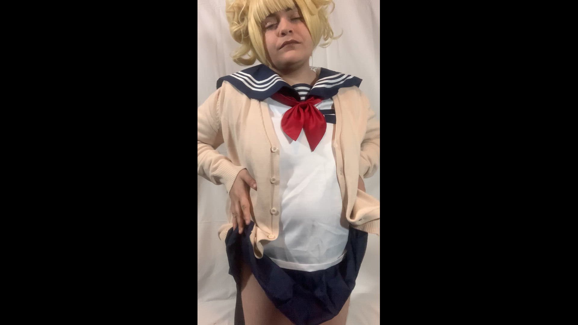 I transform into Himiko Toga and start with a playful tease in my uniform, slowly unbuttoning to reveal my perky assets. Watch me get wild, stripping down completely and showing off every curve with a mischievous grin. I invite you to enjoy the full reveal in this steamy cosplay session.