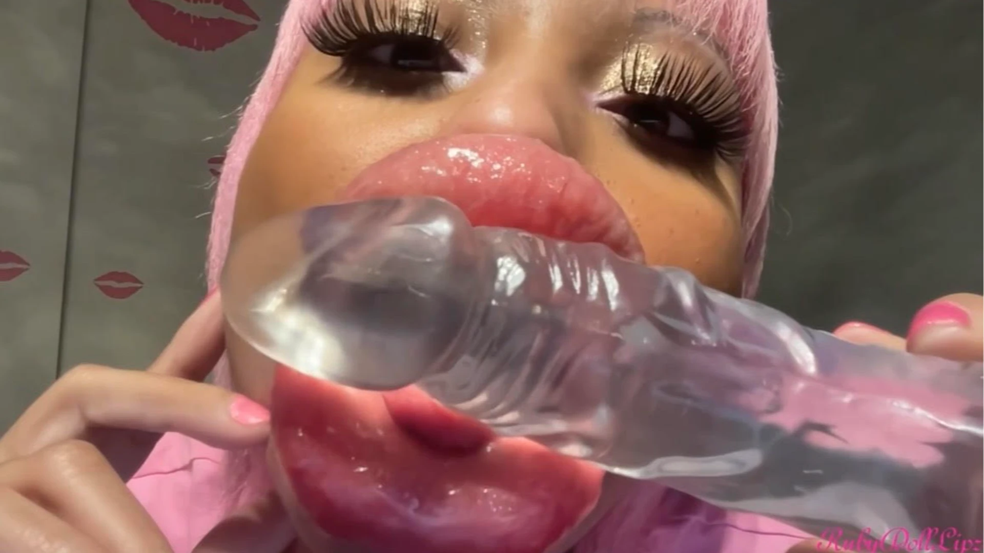 Bimbo lip stretches before my next lip expansion appointment? Yes! This vid was inspired by an interesting experience. My Clear-Pink Miracle Lip Gloss covers my impressively enormous pout, while my lips are on full display. My widened eyes go cross-eyed every now and then, as I flex the true fullness of my filler mouth, turn to both sides to show off my incredible projection, and introduce my Clear Dildo Cock in between my pout. Watch it slide back and forth, highlighting every detail. This cock toy loves sliding deep into my cheeks, making them bulge.