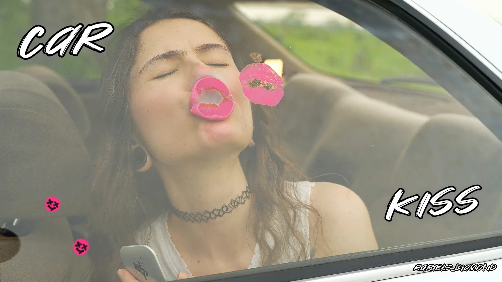 A video shows a girl sitting in a car, playfully applying clear and pink lipgloss. She presses her lips against the window, leaving multiple lipstick marks in various shapes. Her actions are suggestive, with a mix of flirty and bold gestures, smudging the gloss deliberately to create a messy, smeared look on the glass. The window ends up covered in a chaotic pattern of glossy imprints, reflecting her provocative antics