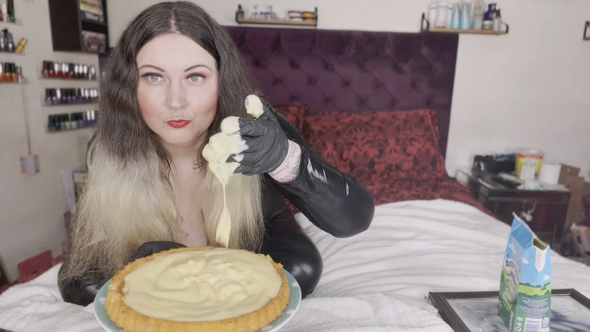 She describes how she's going to cover you in custard pie, fart in your face, make you smell her sweaty socks and feet, then how she'll be laughing while flicking ash over her worthless obedient slave.