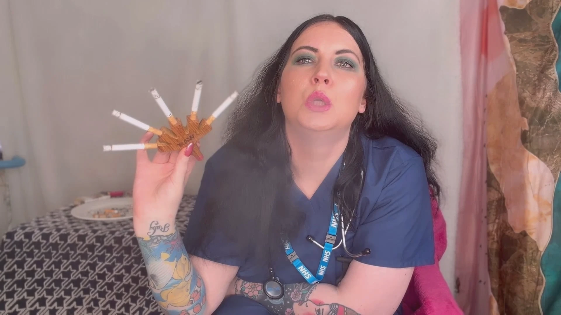 Nurse FFW is gagging to smoke some cigarettes, so she uses her new fiveway holder to light up multiples at once. It's so intense she ends up in coughing fits!