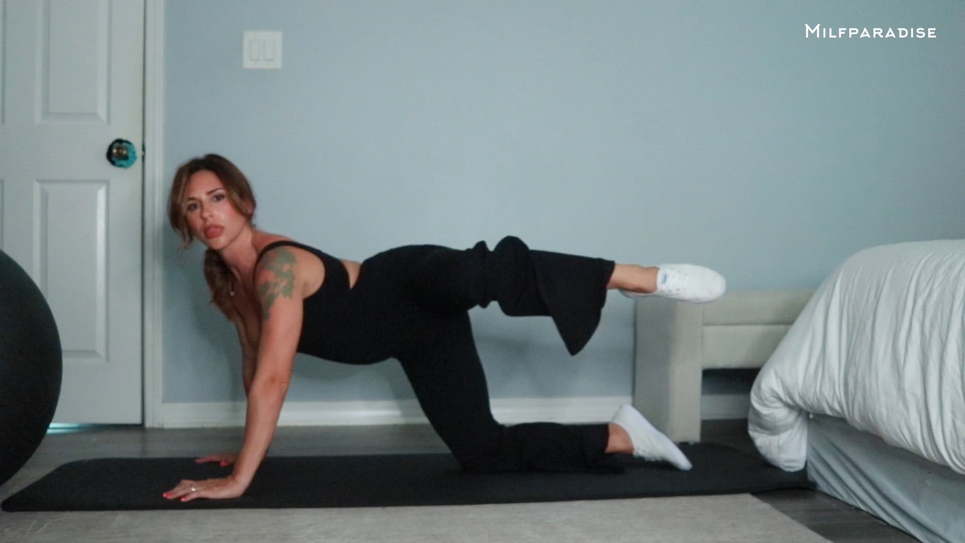 She does pilates in her sexy pilates outfit and white sneakers. Non-nude with lots of cleavage.