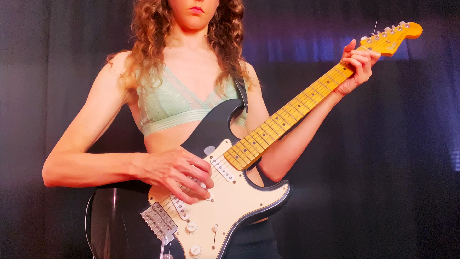 I'm playing guitar wearing a bra, first playing soft arpeggios with My fingers, with close-ups on My veiny hands, fingers and long nails, then stroking chords with a pick, first slowly then going faster and faster and harder until finished.