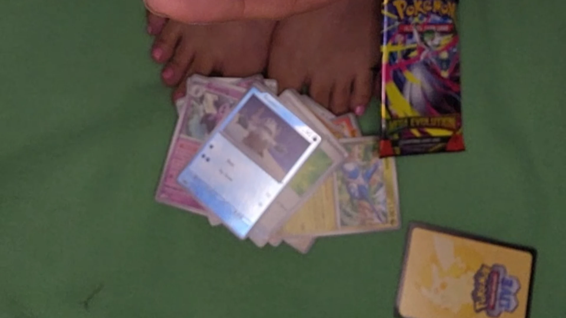 You caught me ripping one of your Mega Evolutions pack! I did it because you love the way my feet look with cards all over them. What hit will I pull?
