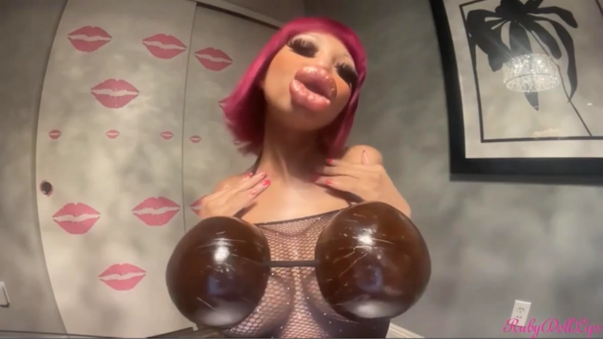 This POV Bronzeberry Kisses video features a seductive display with my Blow-Up Doll pout covered in BronzeBerry Lipstick. Enjoy a variety of kiss styles, from gentle to aggressive, with lip sounds, moaning, pink tongue, sensual plastic talk, plenty of licking action, roleplay, and dominant energy. The visuals create an immersive experience of being engulfed by an intense, oversized pout. Get lost in a coconut, tropical fantasy.