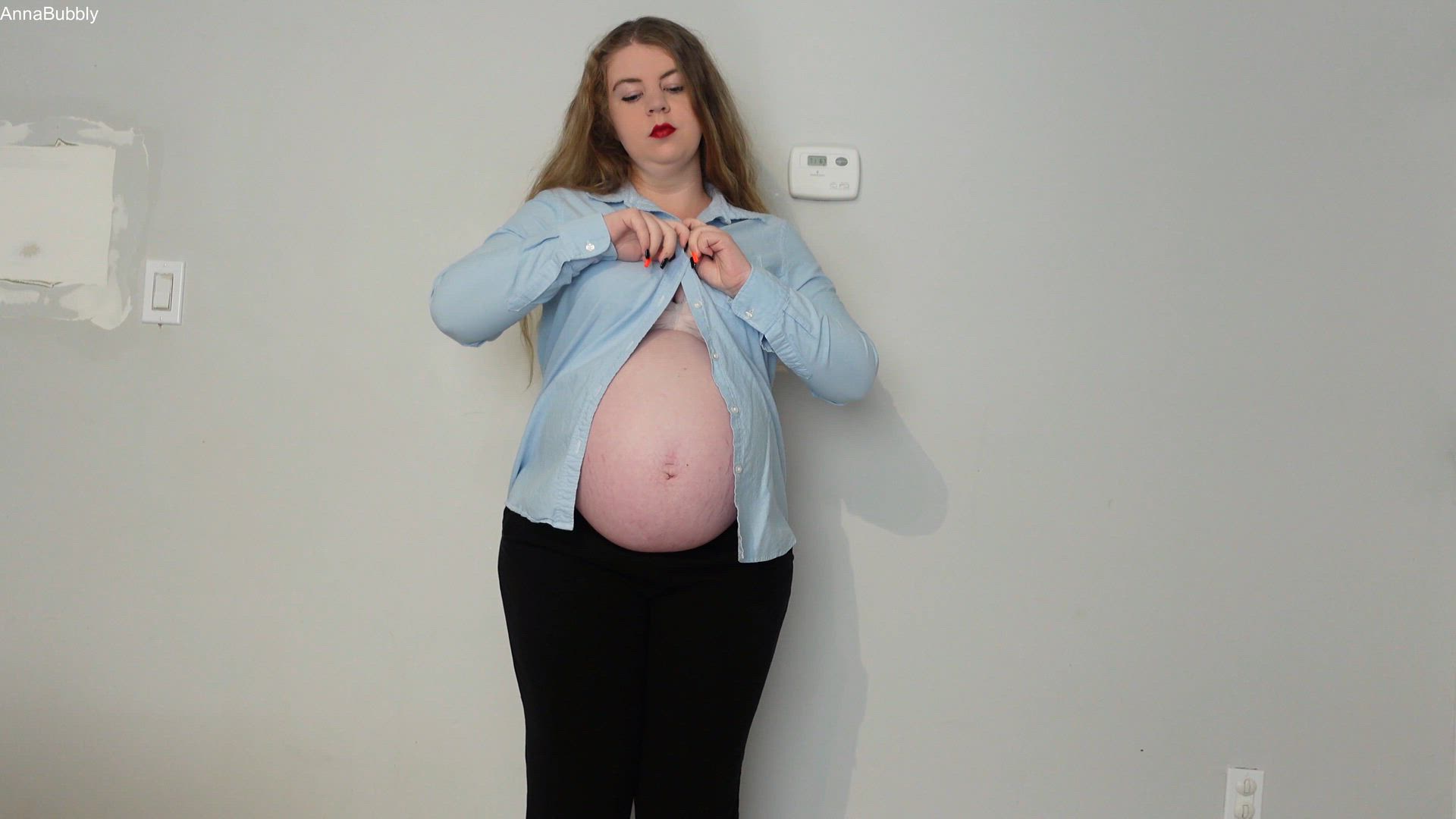 I am 9 months pregnant, my belly nice and huge. I put on two different button up shirts and show them off, heavy focus on my belly. My belly looks like its about to pop a button, burst right out of my shirt!