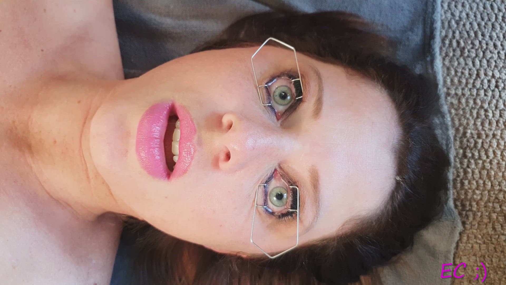 Lying down naked, showing my belly and allowing him cum into BOTH of my eyes while using the speculums in both eyes. I mention to you that my eyes are dry and hurting because I am uncomfortable at night with this belly etc He cums in both my eyes and after a while remove them and I use my fingers to try and scoop back the cum running out of my eyes.