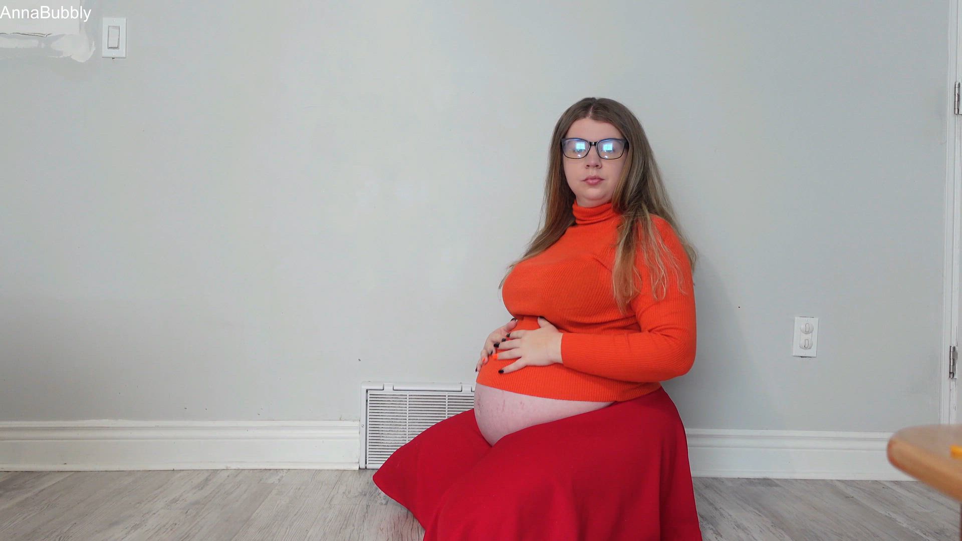 9 months pregnant, Velma starts off looking for her glasses. I put them on and strip naked, leaving my knee high socks on. I spread my ass too, showing off my naked pregnant body.
