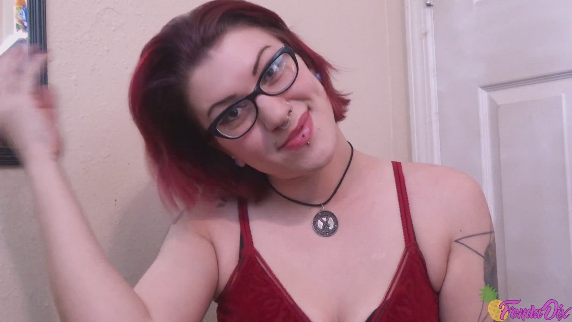 While wearing my skin tight sexy onesie I go about brushing out my chin length hair. I run my brush through it all over, making sure to get any tangles out that I can fine. After I get done I run my fingers through it & play with my hair
