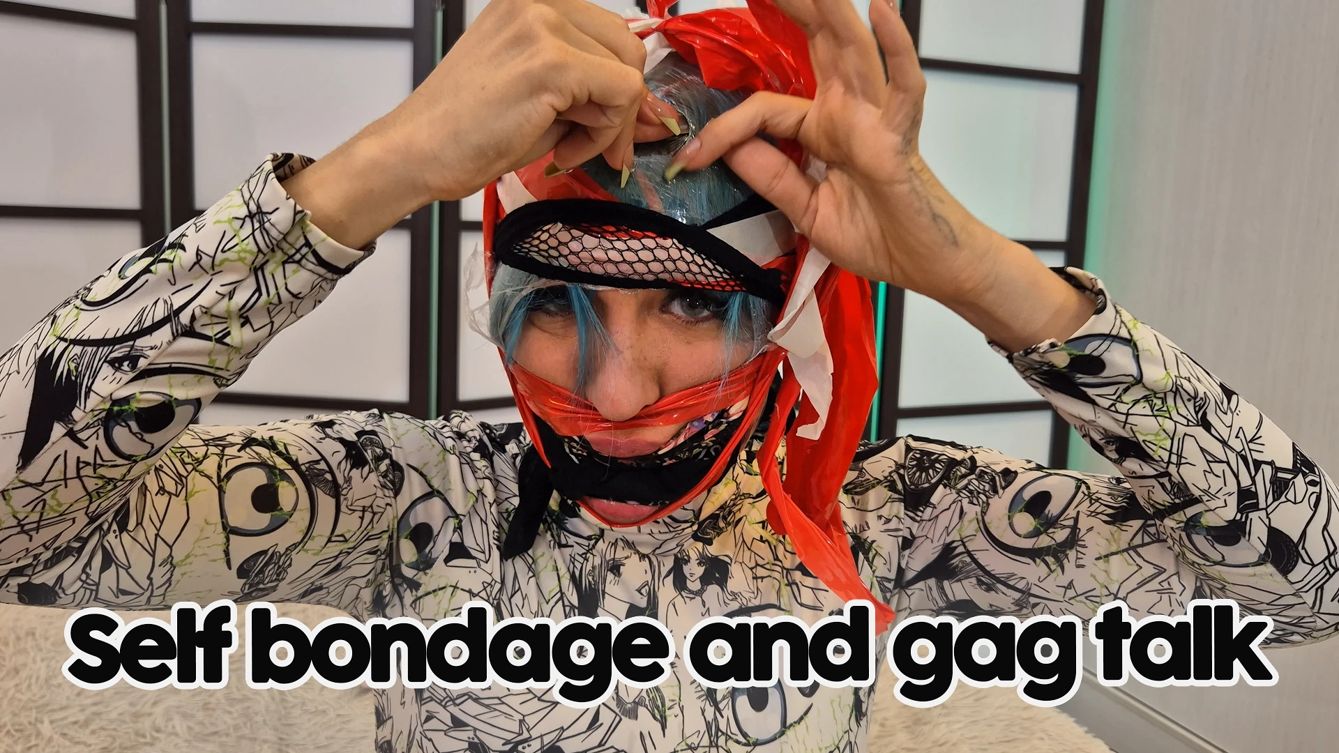 I start with kerchief in my mouth, then a headband, across my face and head, then some film paper covering my eyes, on top of that a fishnet and bondage tape. Finaly some paper tape. Then things start to getting messy at some point, I can´t stop drooling and talking, I feel really restricted and sexy on my face bondage.
