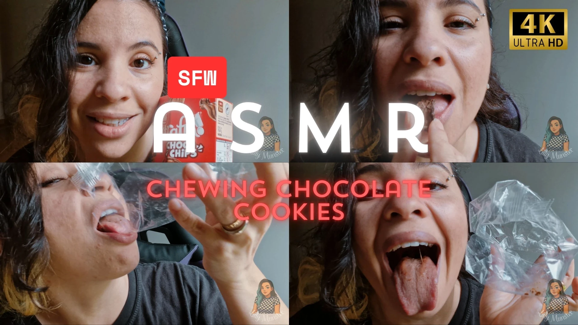 Watch me and listen as I chew and swallow these delicious chocolate cookies. Close-ups of my mouth, eye contact, chewing and swallowing sounds and a lovely view of my teeth and tongue.