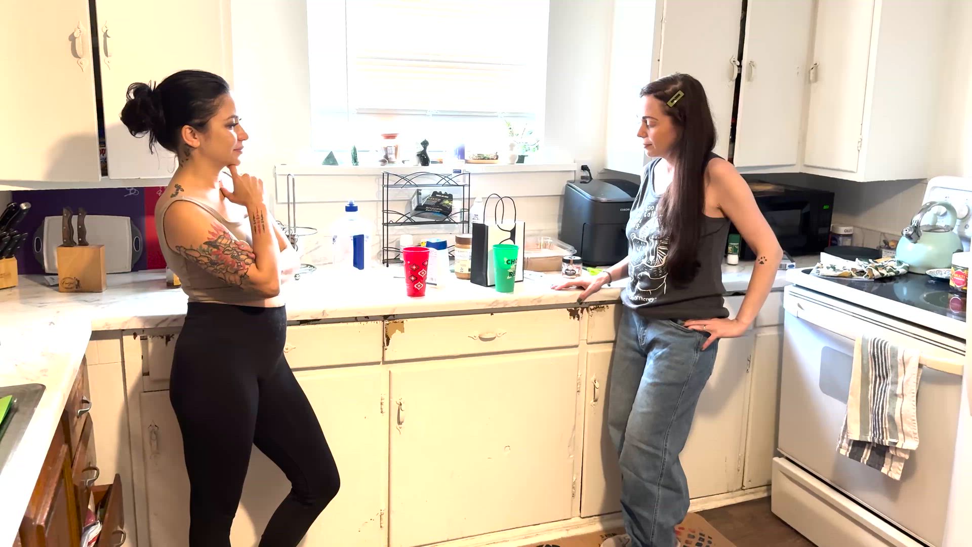 When SluttySarah and Sushii Xhyvette make a toast, they loose their balance and stumble. The magic elixir causes them to land face down on the floor. Throughout the video, they become progressively less clothed, starting with their shirts rising to their midsections. Some time passes and their shirts cover their heads. Then they are topless on the ground exposing their backs. By the end of the video, their buttcracks are clearly in view, and they are on top of one another.