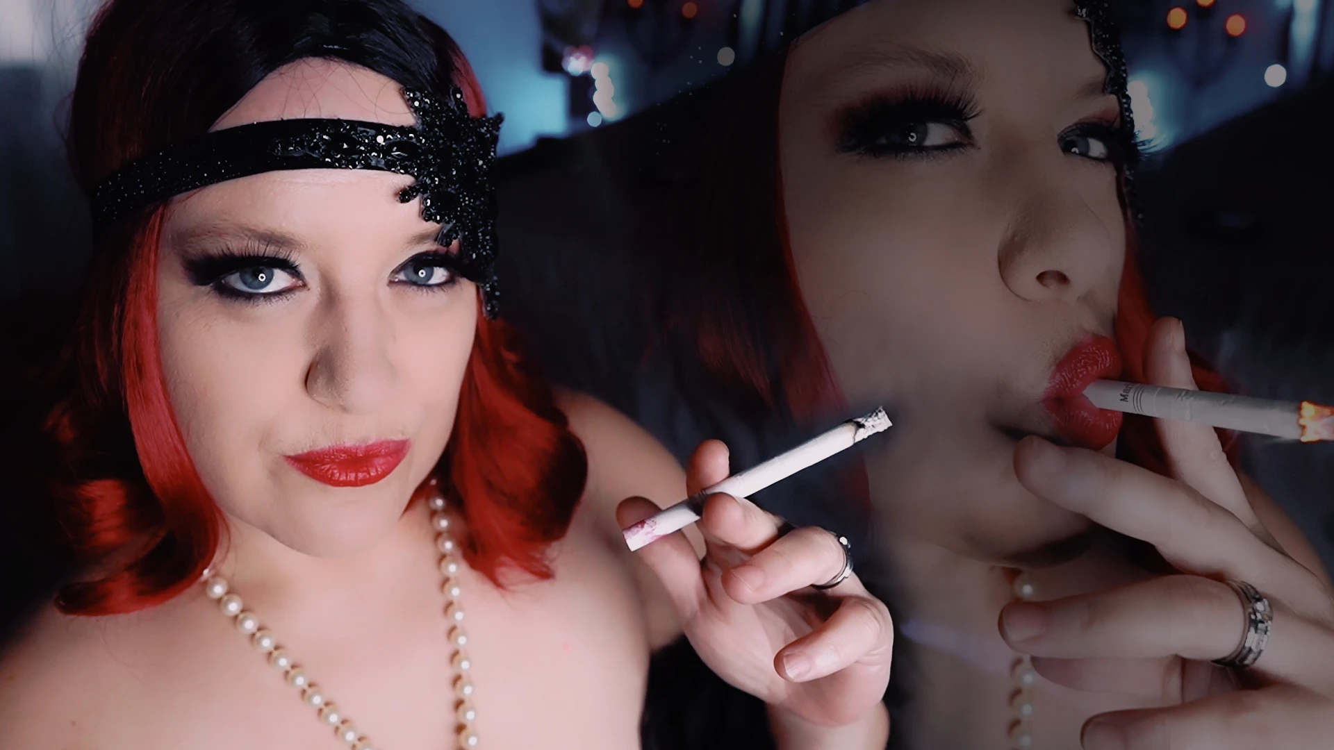 Your naughty flapper is on her feet, my cigarette pack in my dress with one tit out while I smoke and tease you. Then I come towards the cam extra close so you can enjoy seeing my mouth close up as I take in those deep drags and let that sweet creamy smoke roll out for you, drifting out of my lips and getting some french inhales going.