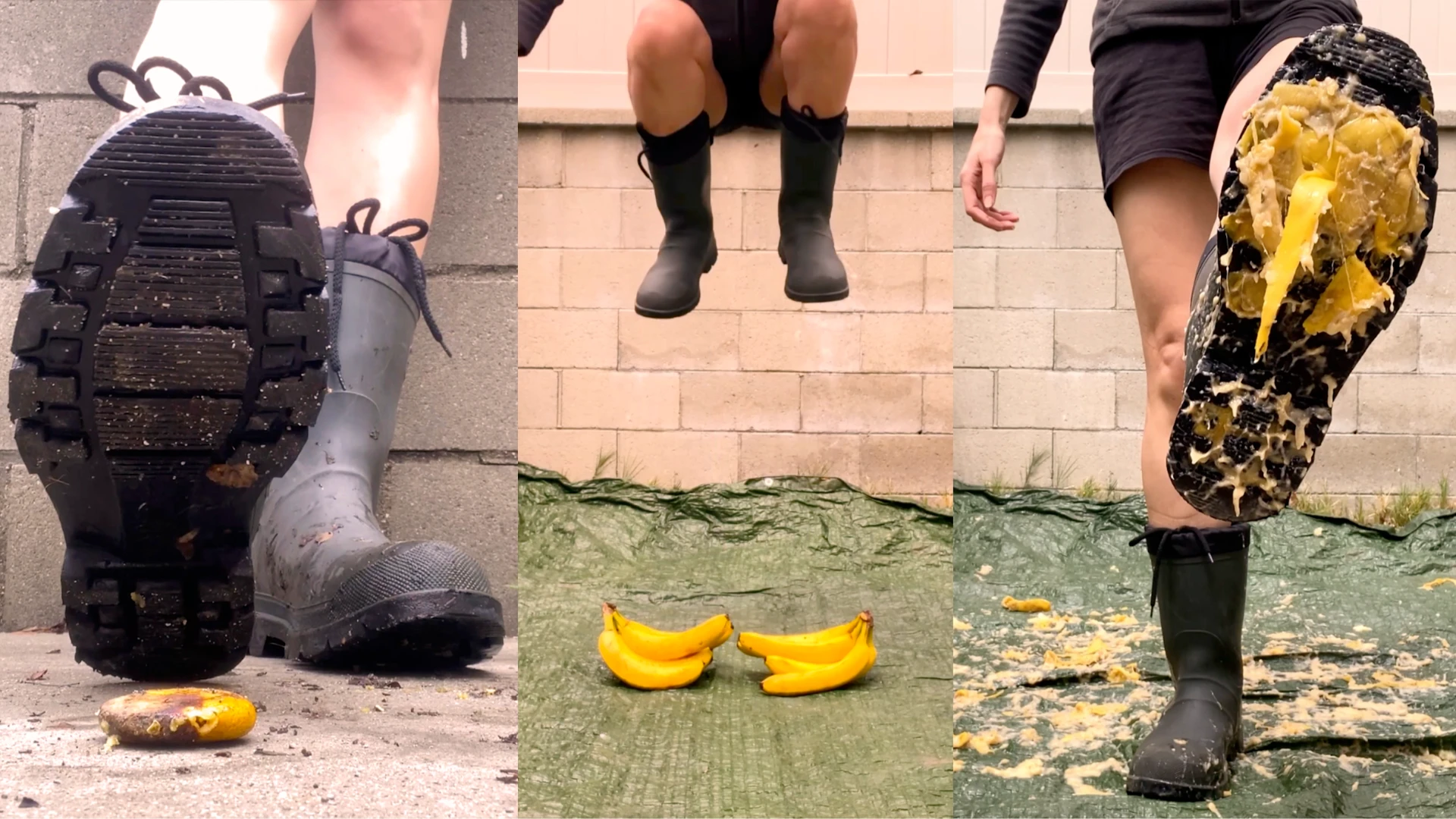 Wearing rubber heavy duty garden boots, I squash a tiny dried yard lemon, and then a whole bunch of bananas, stomping and jumping on them, squeezing them, and I left no survivor! And I show you My dirty soles.