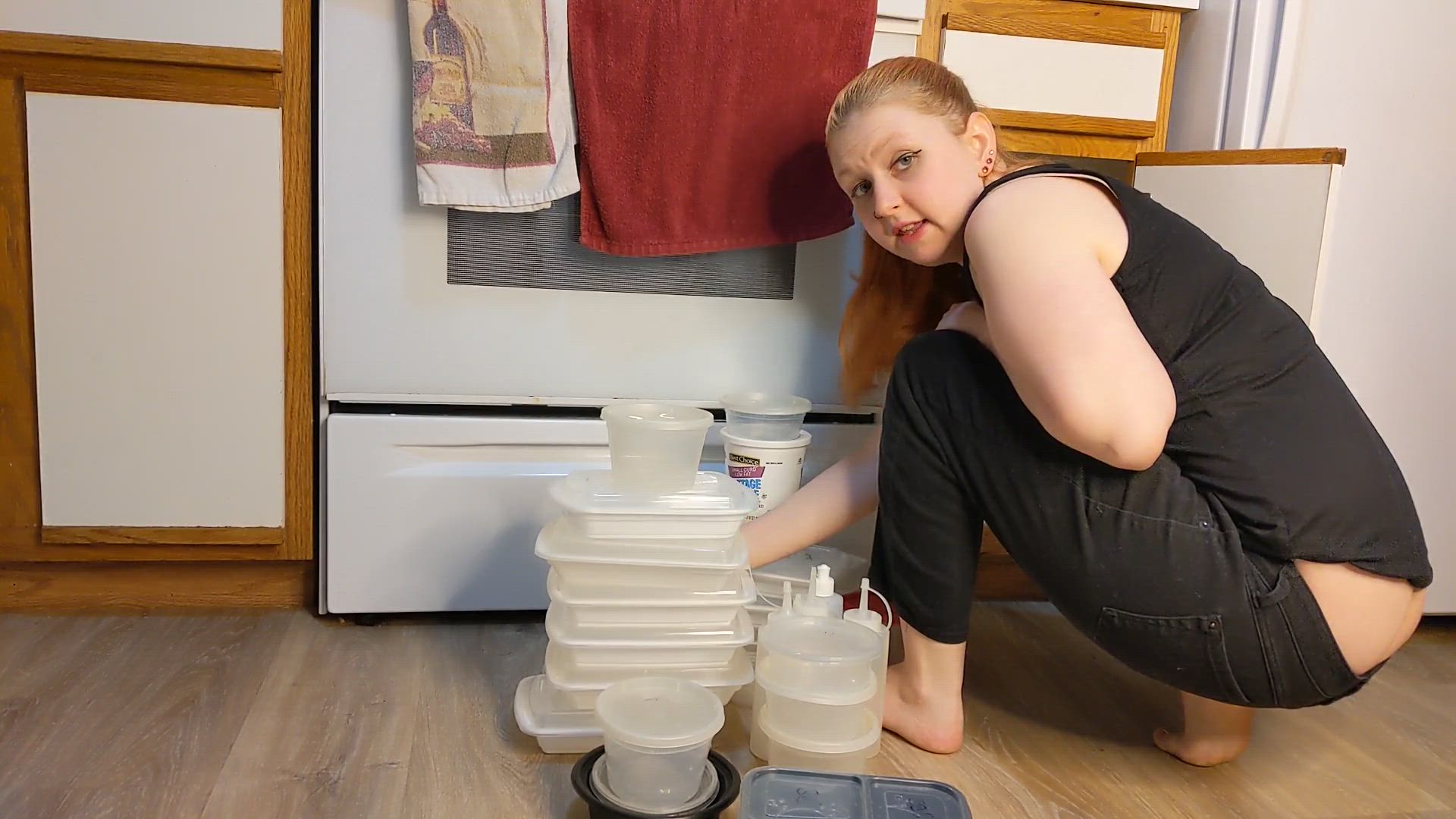 "StepMommy's Buttcrack Exposed Organizing the Tupperware" - Are you really going to just sit there and watch me clean up. You were supposed to do this! I don't want to hear you complain about my buttcrack being out. You know what, if you want to stare so much, why don't you get your face up in there.