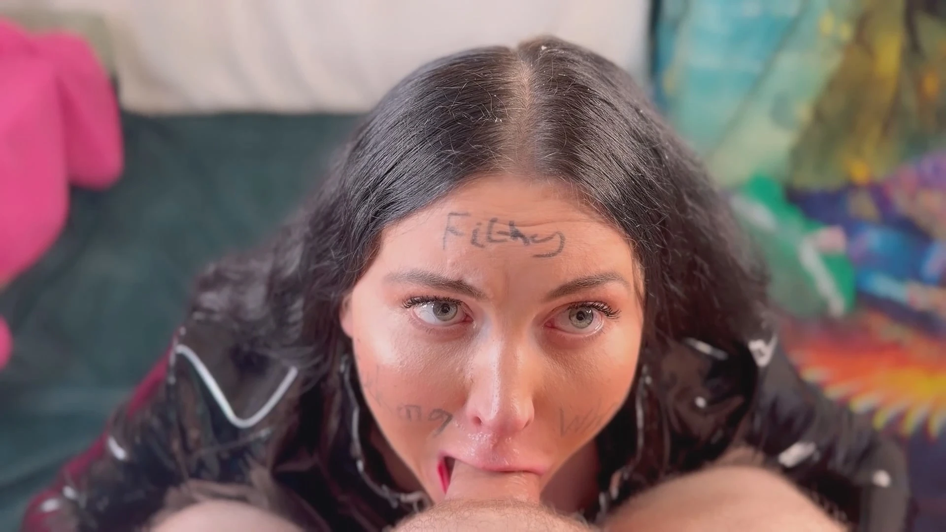 Sub FFW is ready to please Sir in any way he wants. He has her kneel between his legs and writes Filthy Fucking Whore over her fave. Then she proceeds to give him a sloppy blowjob with deep throat and a cum in mouth finish, which she proceeds to swallow.