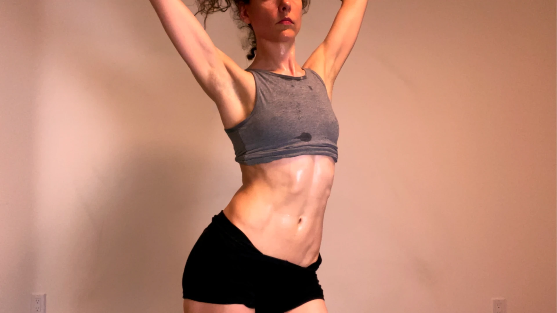 After an intense ballet class, I’m all sweating and stinky. I’m wearing a form fitting crop top, short shorts, and half-soles ballet slippers. I’m showing you My sweaty body, torso, abs, back, neck, armpits (which are slightly hairy), legs and feet, because I know you love it 😃