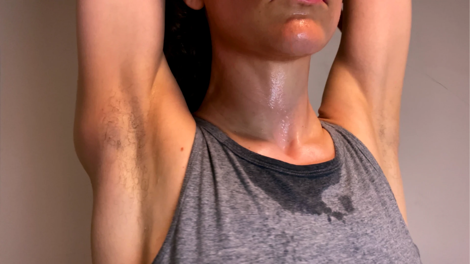 After dance practice, My hairy armpits are sweaty and stinky. First I show My sweaty body, then I show My armpits to you for a while while they're sweaty, then I come back after I'm dry and show them again, then I remove the hair with tweezers, and show you My hairless armpits in the end (which have little red marks from the hair removal).