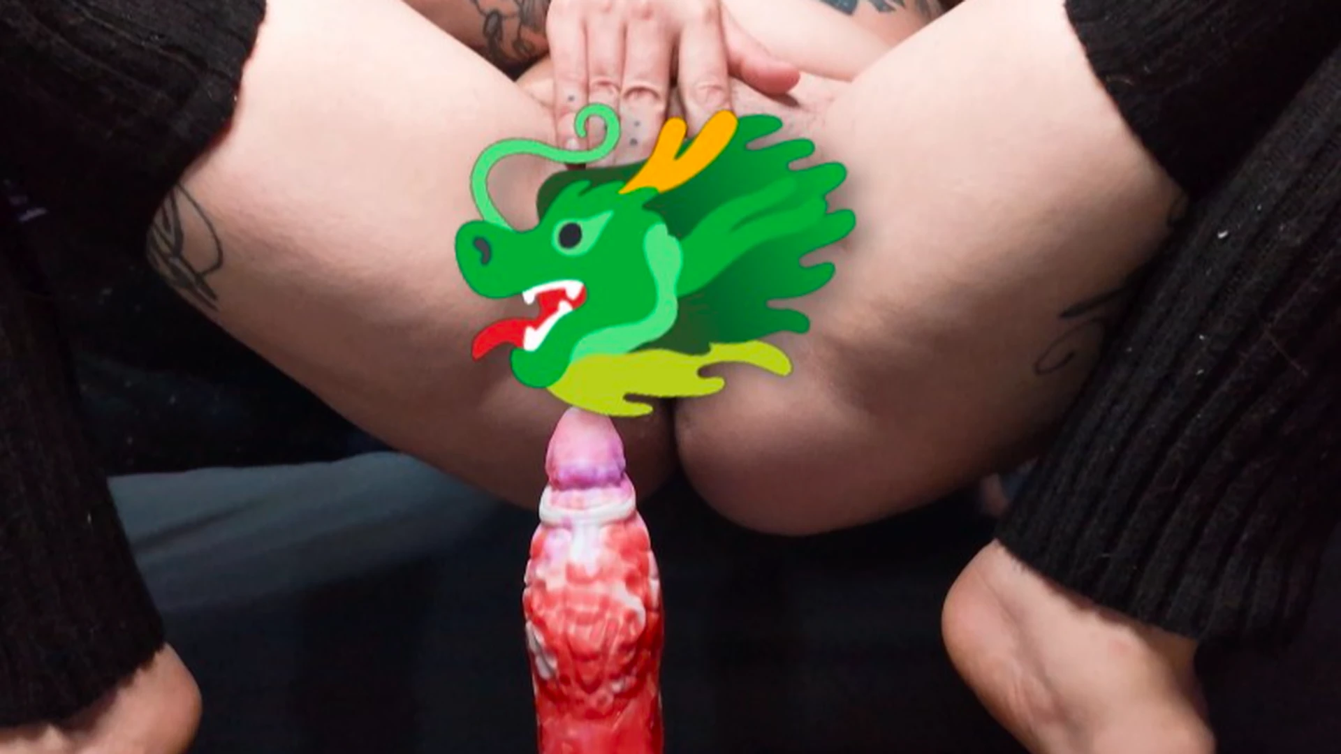 Watch me stretch my tight hairy pussy on that dreaded slippery Red Dragon cock - get a view from the front and the back 😉