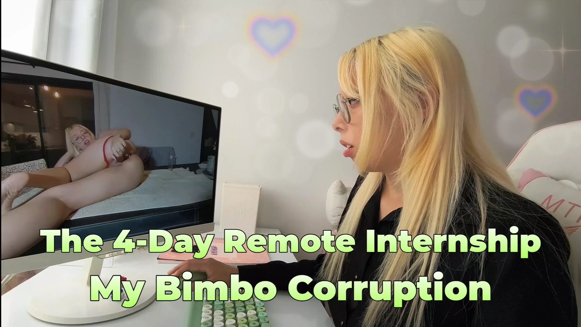 In this 40-minute epic, you'll watch my complete transformation over four intense days. Each day, my boss sends me new instructions, new outfits, and new toys that I just can't resist. You'll see me go from a serious, buttoned-up professional to a total, mindless Bimbo who only lives for pleasure and exposure.